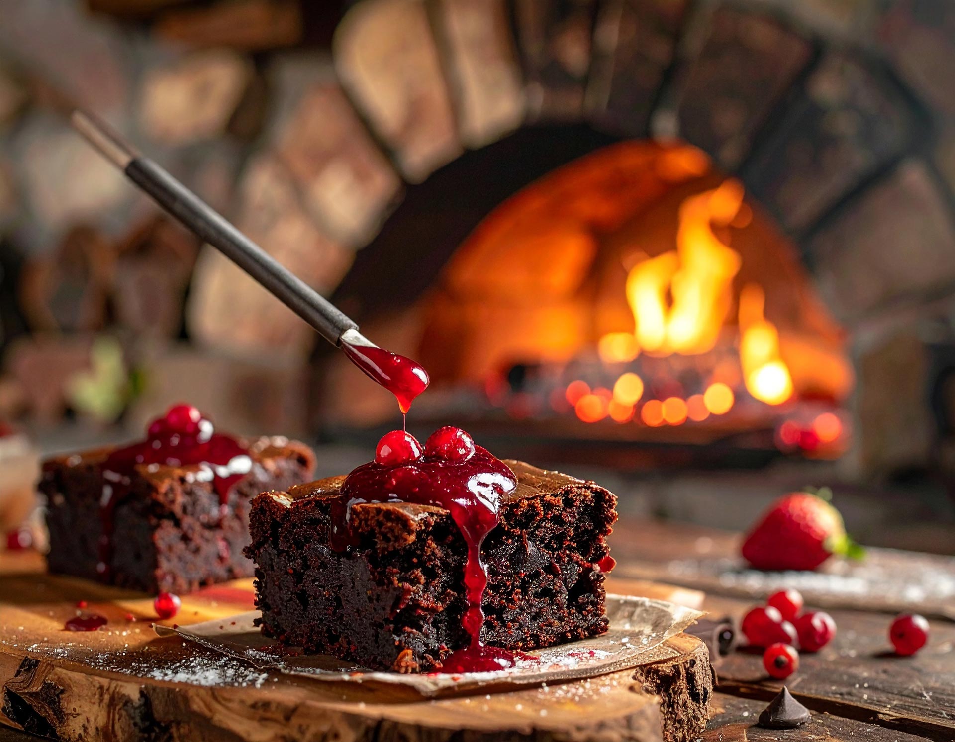 Sabroso brownie de chocolate con culis de frutos rojos.