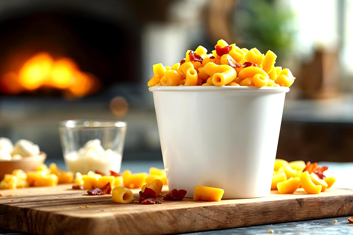 110 gr. de delicioso Mac & Cheese sazonado en mantequilla, con tres quesos y acompañado de sabrosos trocitos de tocino.