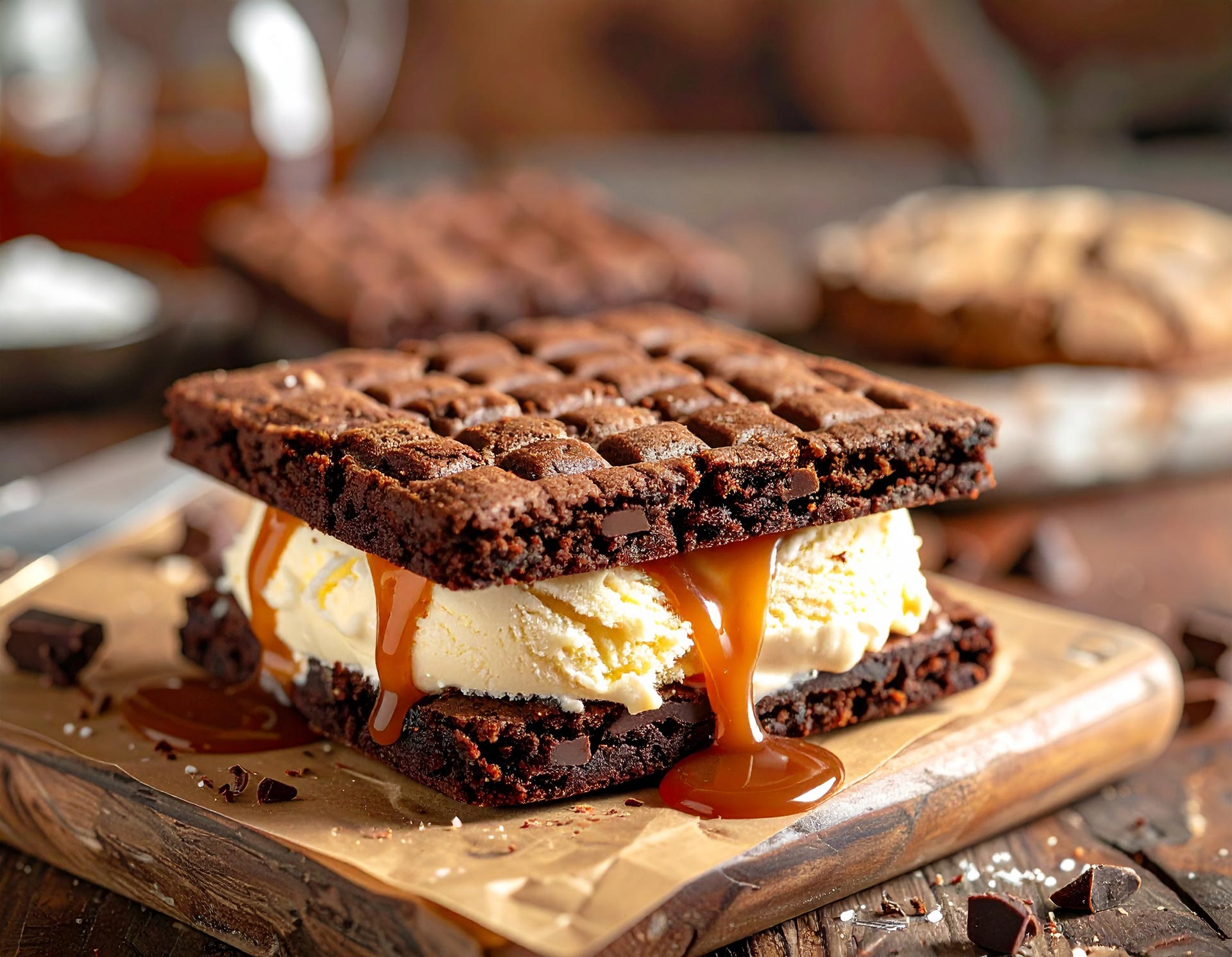 Exquisita galleta casera rellena de helado de vainilla, aderezada con salsa de caramelo y chocolate.
