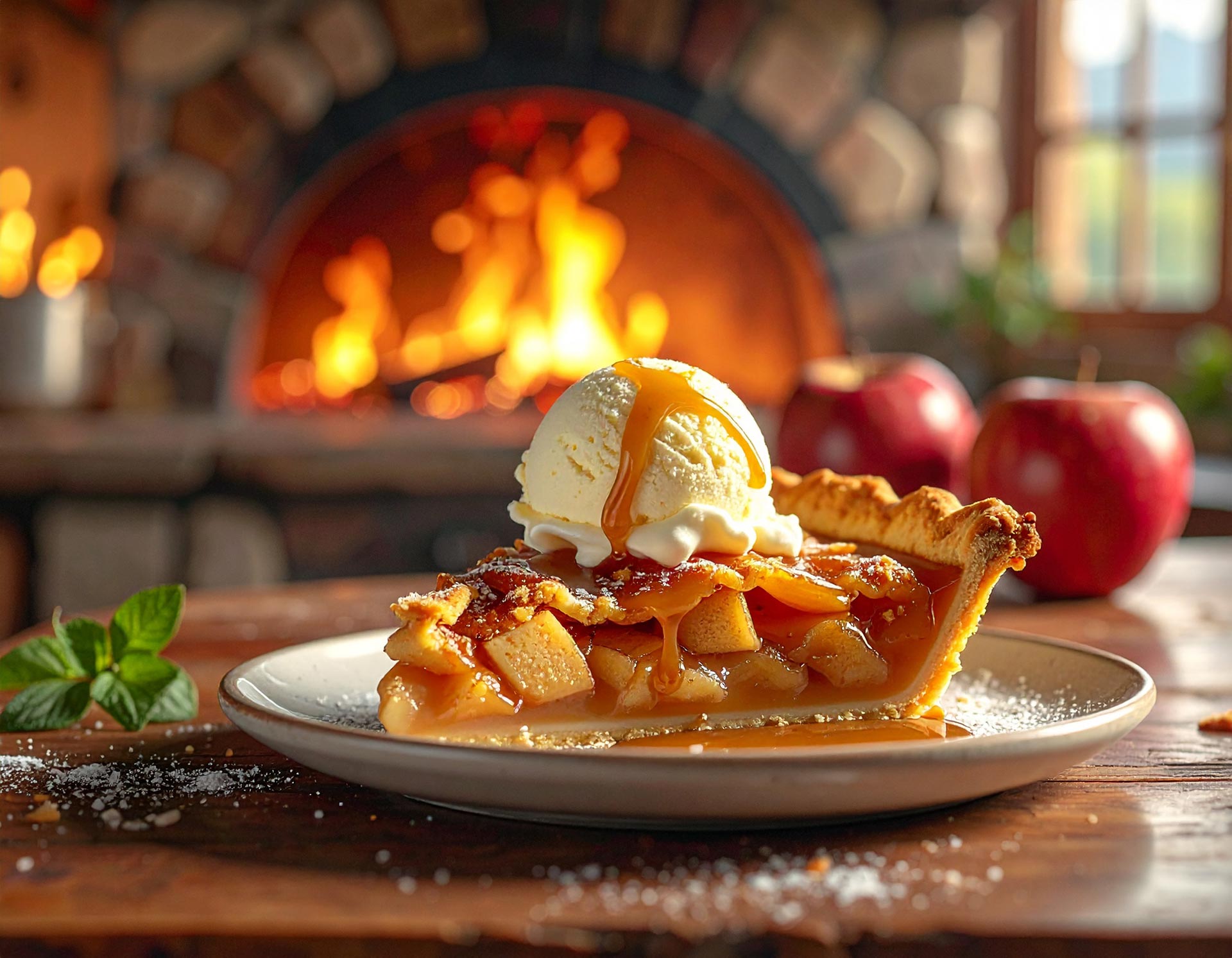 Exquisita rebanada de tarta de manzana casera con salsa de caramelo y una bola de helado de vainilla.