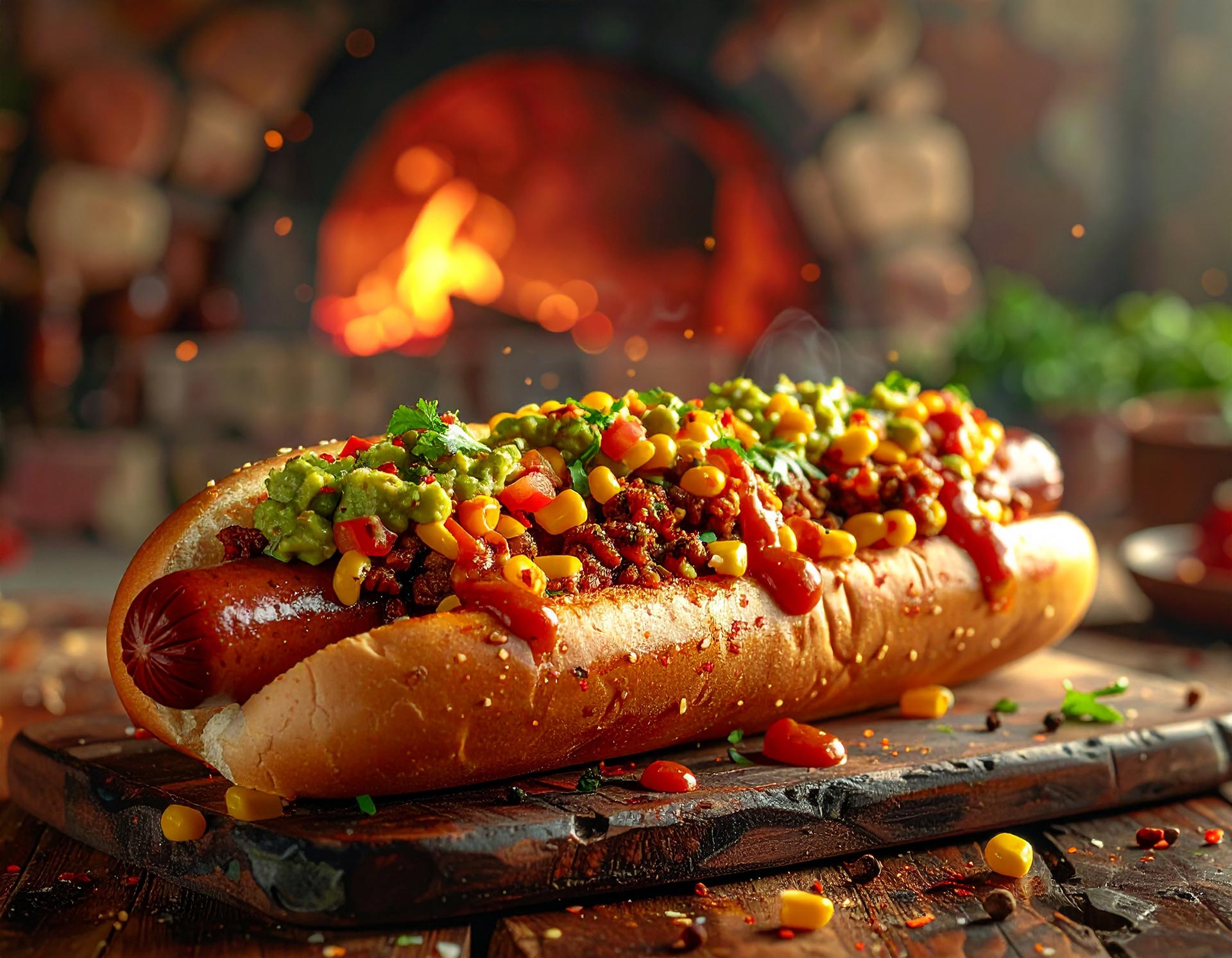 Salchicha gigante (100 gr.) con chili, guacamole y elote.
